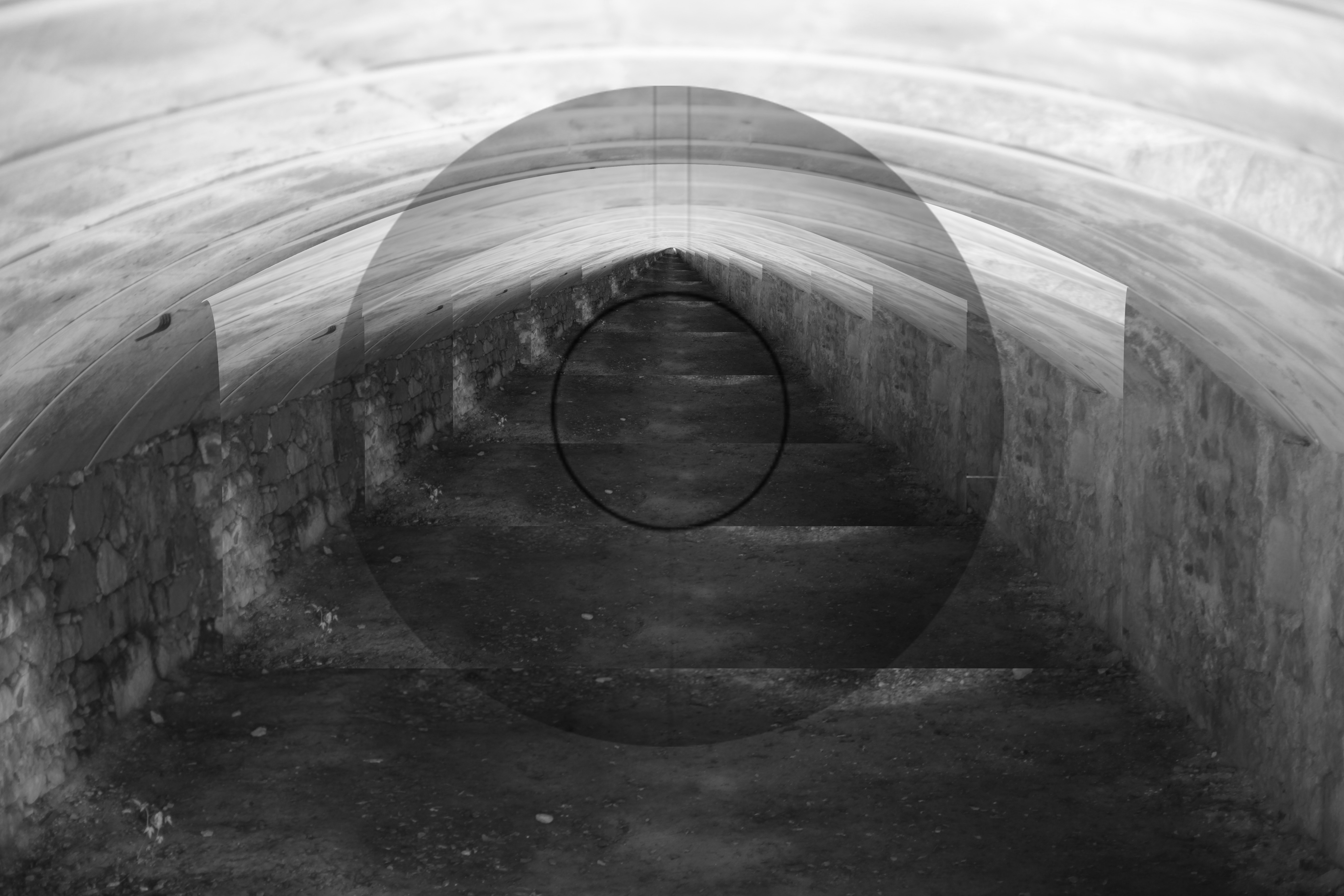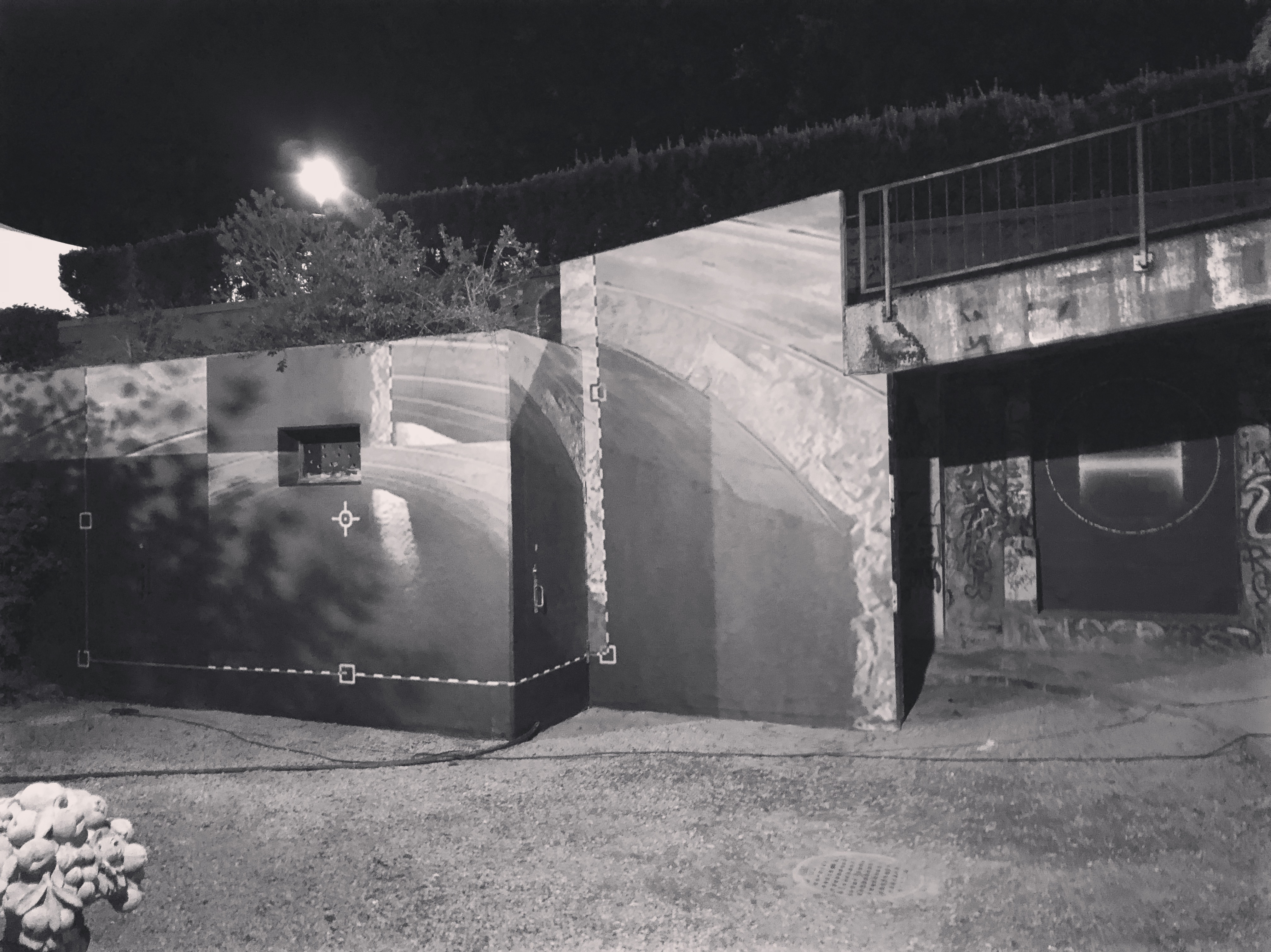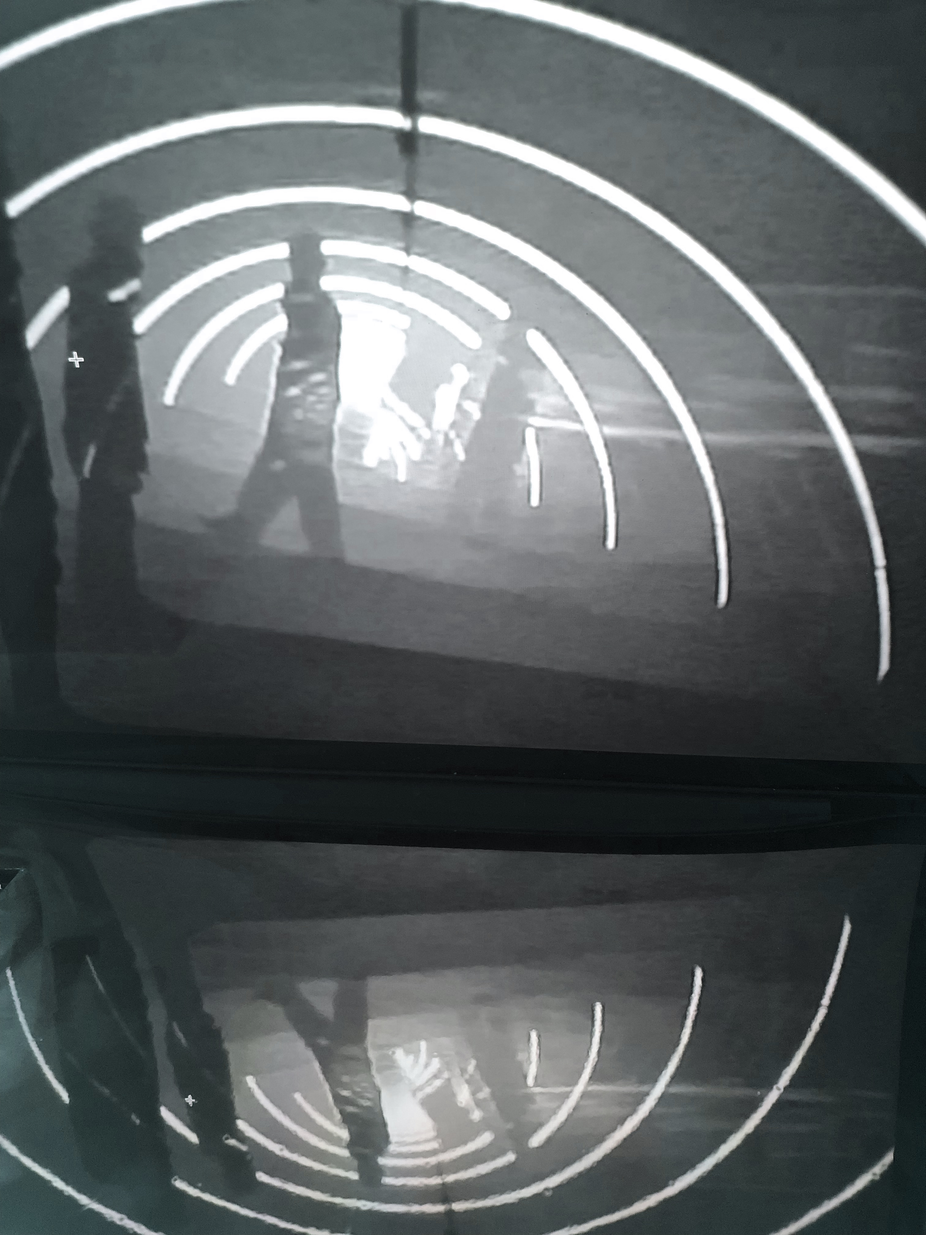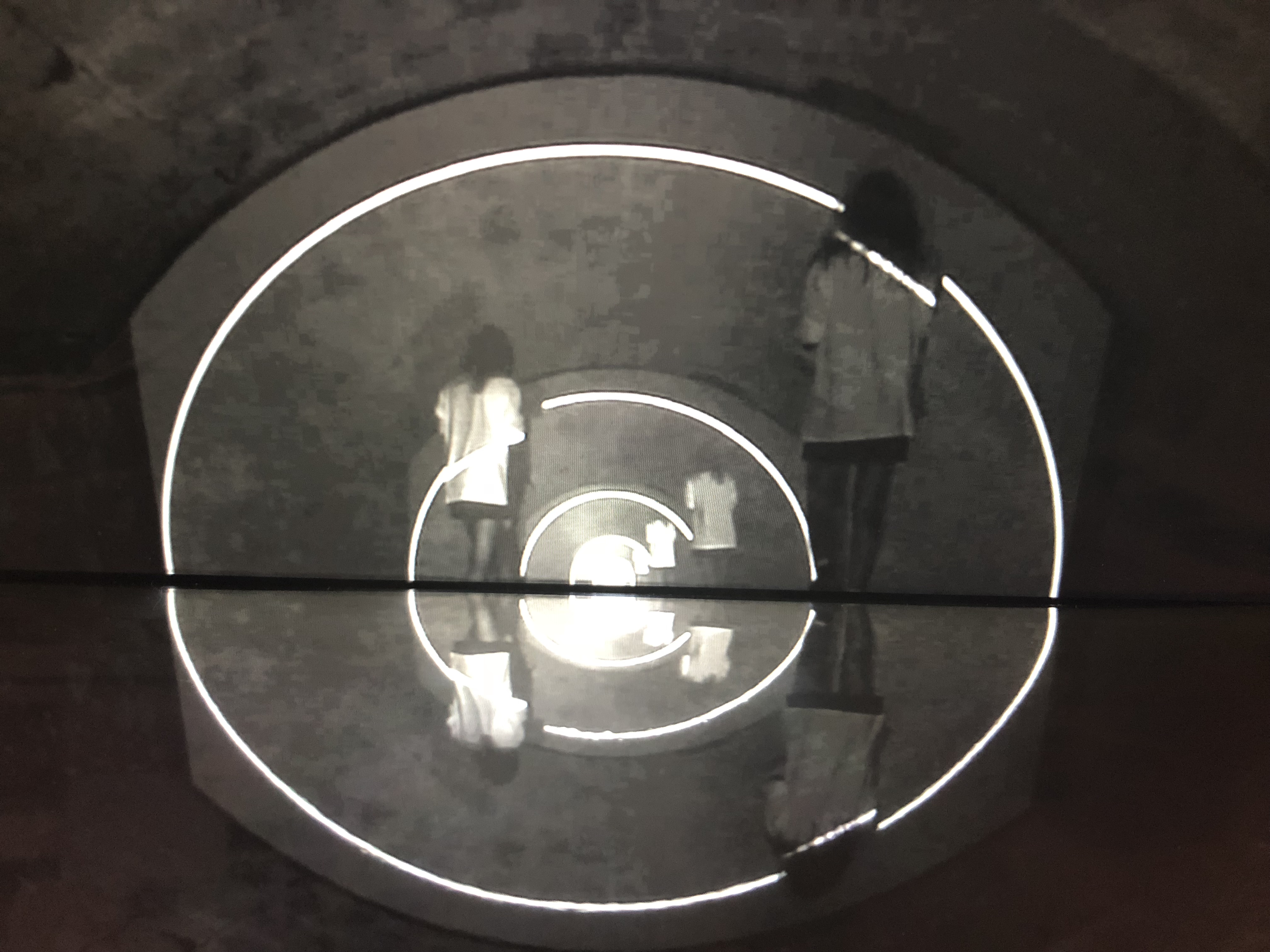 A motion sensor camera placed at the entry of the cave films the space in real-time. A projector transmits this image with a few seconds of time delay to a screen placed at the far end of the room. The video footage is projected with a time-shift so as to provoke a loss of reference, a certain disorientation, in the spectator who is seeing and following an infinite number of versions of postponed self.