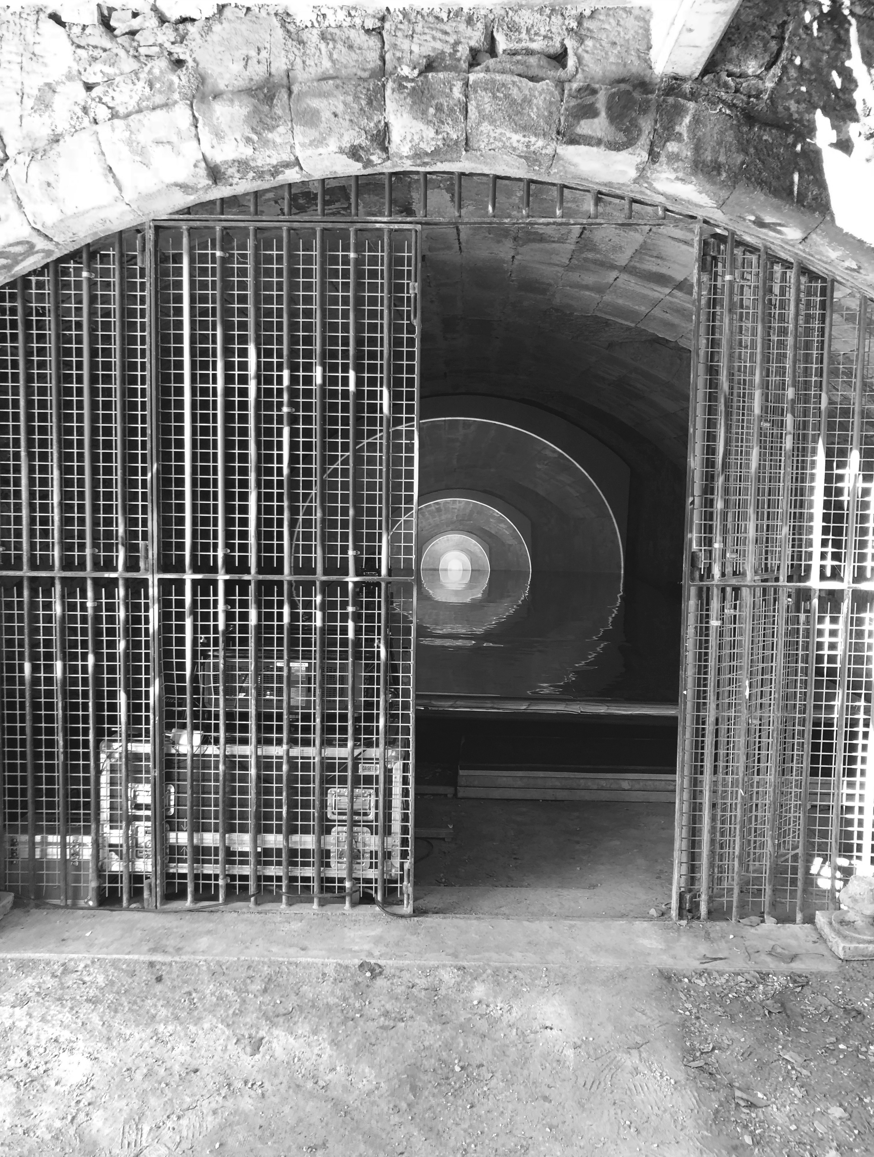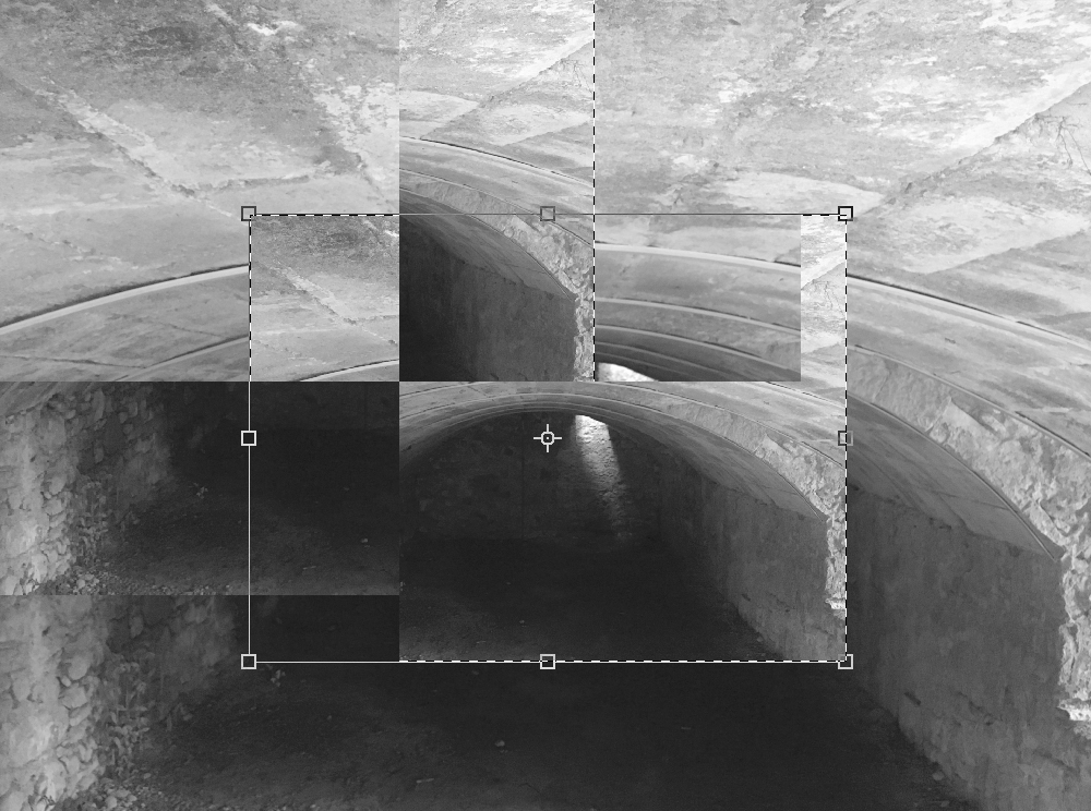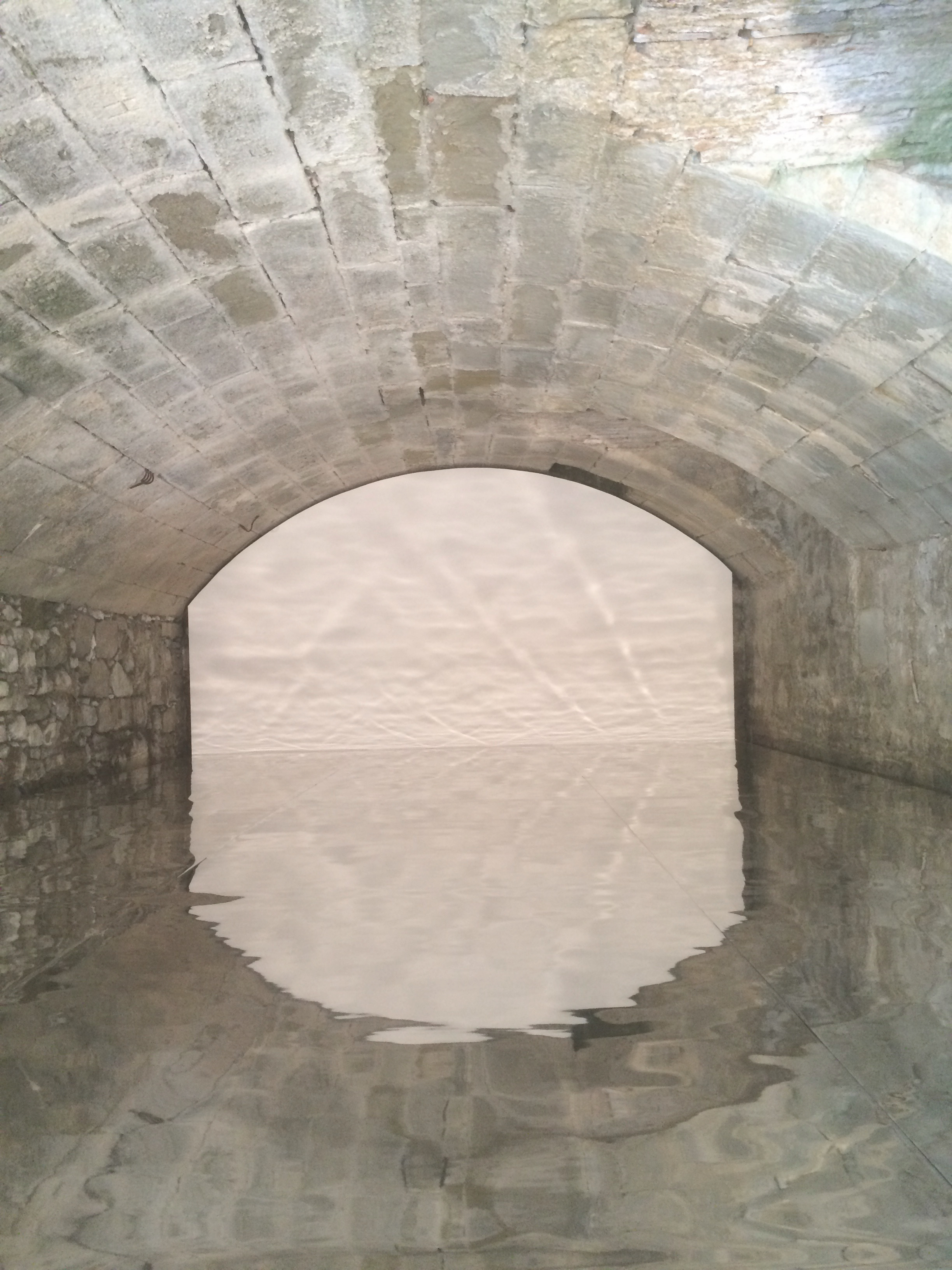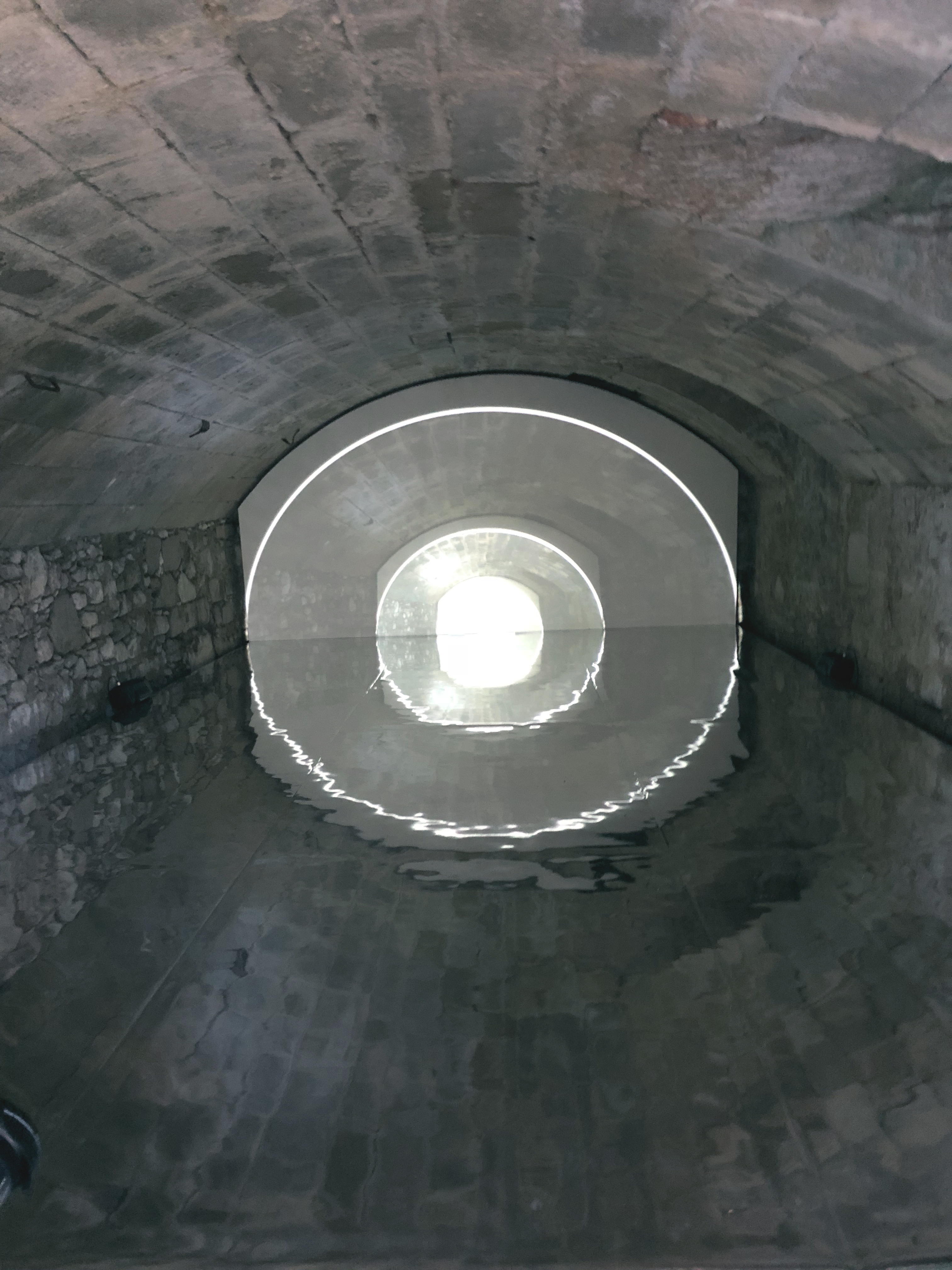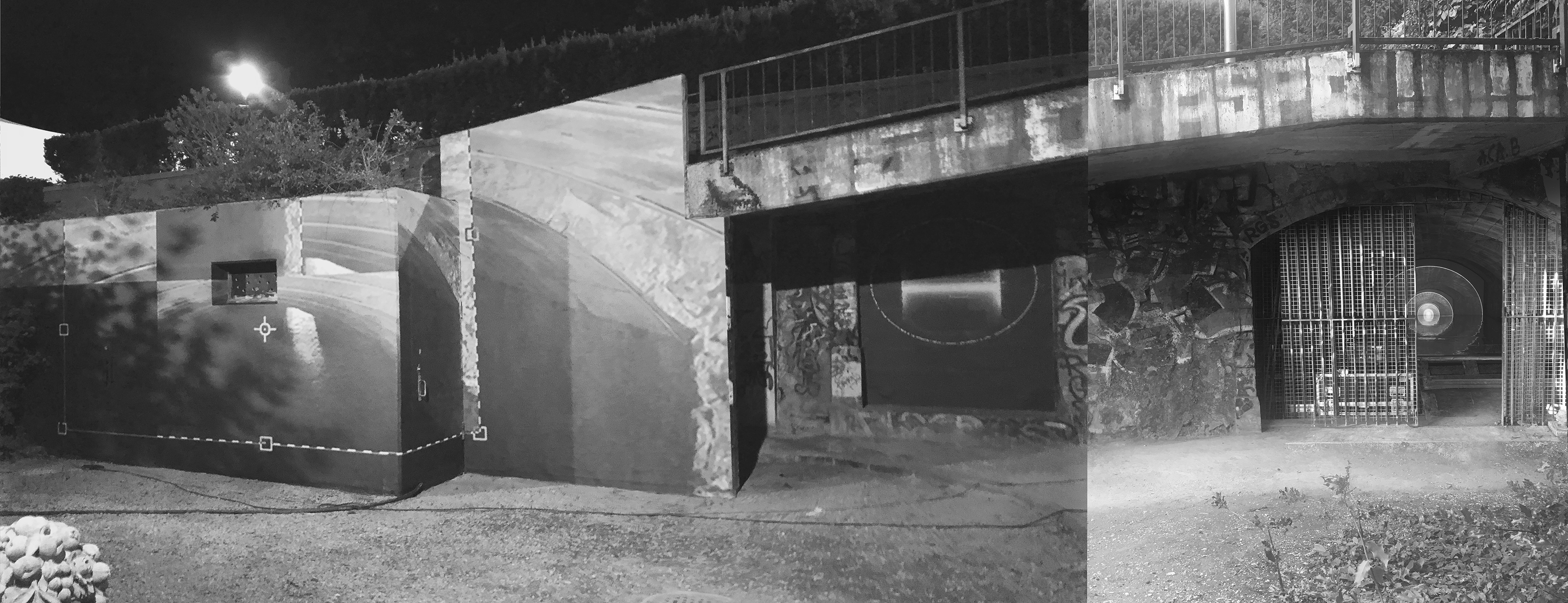 A motion sensor camera placed at the entry of the cave films the space in real-time. A projector transmits this image with a few seconds of time delay to a screen placed at the far end of the room. The video footage is projected with a time-shift so as to provoke a loss of reference, a certain disorientation, in the spectator who is seeing and following an infinite number of versions of postponed self.